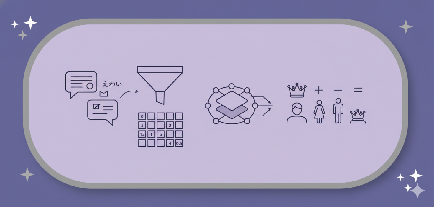 王様 - 男性 + 女性 ≒ 女王)