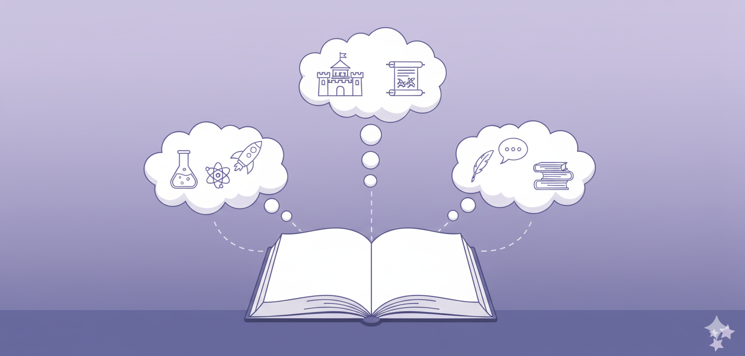ジャンル分けされていない図書館(=大量の文章)で、AI司書が本を1冊ずつチェック。「『宇宙』『実験』が多いから、これは“科学”だな」「『武将』『合戦』が多いから、これは“歴史”だな」と、自動で話題のグループ(トピック)を見つけ、分類してくれるイメージです。